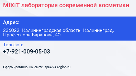 MIXIT, лаборатория современной косметики по адресу 236022, Калининградская область, Калининград, Профессора Баранова, 40 в дальнейшем Организация, размещена в следующих категориях: