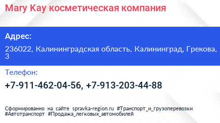 Mary Kay, косметическая компания по адресу 236022, Калининградская область, Калининград, Грекова, 3 в дальнейшем Организация, размещена в следующих категориях: