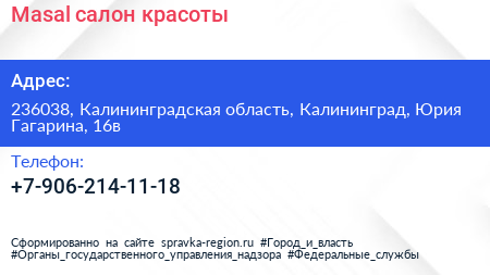 Masal, салон красоты по адресу 236038, Калининградская область, Калининград, Юрия Гагарина, 16в в дальнейшем Организация, размещена в следующих категориях: