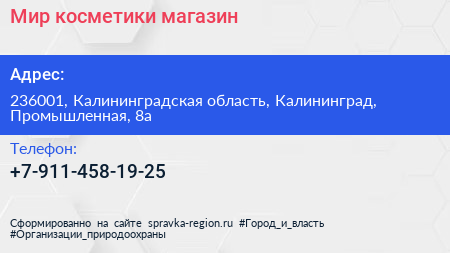 Мир косметики, магазин по адресу 236001, Калининградская область, Калининград, Промышленная, 8а в дальнейшем Организация, размещена в следующих категориях: