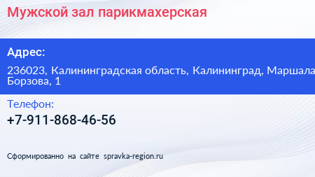 Мужской зал, парикмахерская по адресу 236023, Калининградская область, Калининград, Маршала Борзова, 1 в дальнейшем Организация, размещена в следующих категориях: