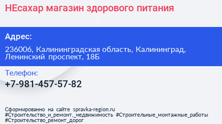 НЕсахар, магазин здорового питания по адресу 236006, Калининградская область, Калининград, Ленинский проспект, 18Б в дальнейшем Организация, размещена в следующих категориях: