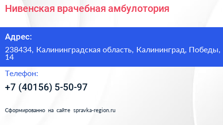 Нивенская врачебная амбулотория по адресу 238434, Калининградская область, Калининград, Победы, 14 в дальнейшем Организация, размещена в следующих категориях: