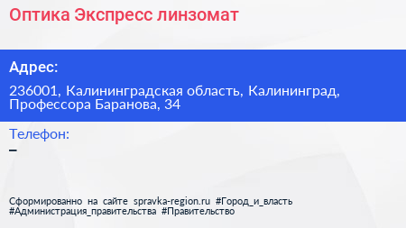 Оптика-Экспресс, линзомат по адресу 236001, Калининградская область, Калининград, Профессора Баранова, 34 в дальнейшем Организация, размещена в следующих категориях: