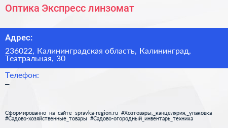 Оптика-Экспресс, линзомат по адресу 236022, Калининградская область, Калининград, Театральная, 30 в дальнейшем Организация, размещена в следующих категориях: