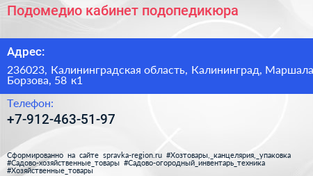 Подомедио, кабинет подопедикюра по адресу 236023, Калининградская область, Калининград, Маршала Борзова, 58 к1 в дальнейшем Организация, размещена в следующих категориях: