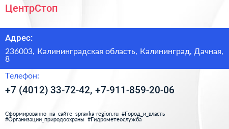 ЦентрСтоп по адресу 236003, Калининградская область, Калининград, Дачная, 8 в дальнейшем Организация, размещена в следующих категориях: