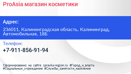 ProAsia, магазин косметики по адресу 236011, Калининградская область, Калининград, Автомобильная, 18Б в дальнейшем Организация, размещена в следующих категориях: