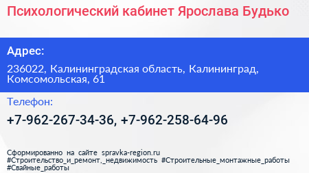 Психологический кабинет Ярослава Будько по адресу 236022, Калининградская область, Калининград, Комсомольская, 61 в дальнейшем Организация, размещена в следующих категориях: