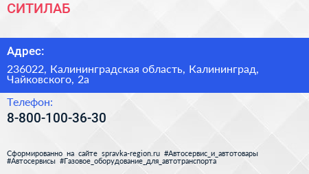 СИТИЛАБ по адресу 236022, Калининградская область, Калининград, Чайковского, 2а в дальнейшем Организация, размещена в следующих категориях: