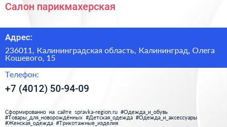 Салон-парикмахерская по адресу 236011, Калининградская область, Калининград, Олега Кошевого, 15 в дальнейшем Организация, размещена в следующих категориях: