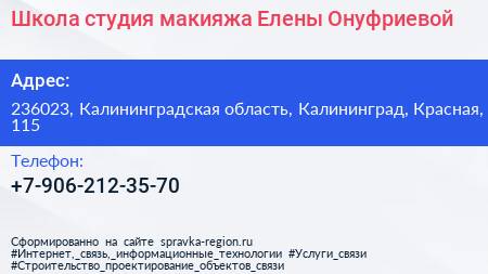 Школа-студия макияжа Елены Онуфриевой по адресу 236023, Калининградская область, Калининград, Красная, 115 в дальнейшем Организация, размещена в следующих категориях: