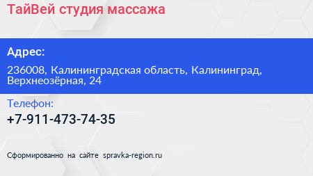ТайВей, студия массажа по адресу 236008, Калининградская область, Калининград, Верхнеозёрная, 24 в дальнейшем Организация, размещена в следующих категориях: