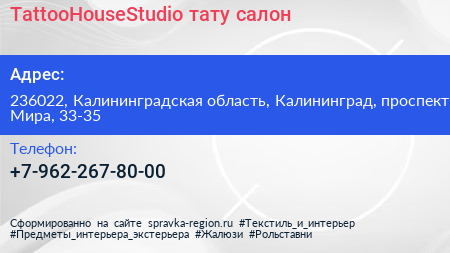 TattooHouseStudio, тату-салон по адресу 236022, Калининградская область, Калининград, проспект Мира, 33-35 в дальнейшем Организация, размещена в следующих категориях: