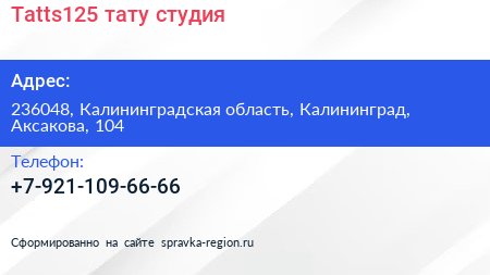 Tatts125, тату-студия по адресу 236048, Калининградская область, Калининград, Аксакова, 104 в дальнейшем Организация, размещена в следующих категориях: