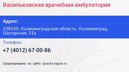 Васильковская врачебная амбулатория по адресу 238310, Калининградская область, Калининград, Шатурская, 51а в дальнейшем Организация, размещена в следующих категориях: