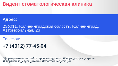 Видент, стоматологическая клиника по адресу 236011, Калининградская область, Калининград, Автомобильная, 23 в дальнейшем Организация, размещена в следующих категориях: