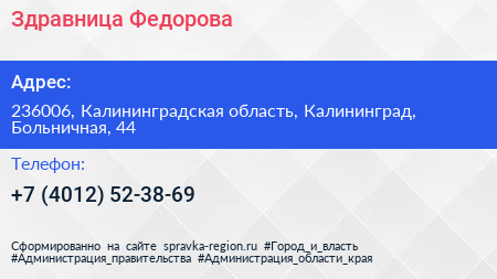 Здравница Федорова по адресу 236006, Калининградская область, Калининград, Больничная, 44 в дальнейшем Организация, размещена в следующих категориях: