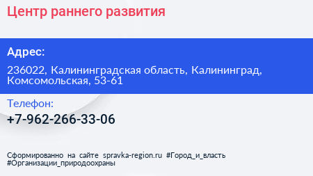 Центр раннего развития по адресу 236022, Калининградская область, Калининград, Комсомольская, 53-61 в дальнейшем Организация, размещена в следующих категориях: