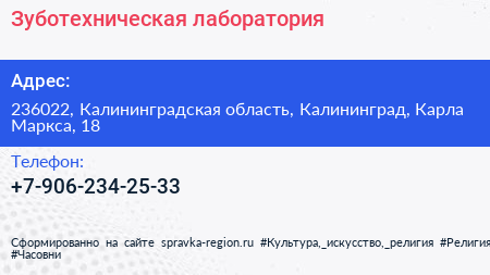 Зуботехническая лаборатория по адресу 236022, Калининградская область, Калининград, Карла Маркса, 18 в дальнейшем Организация, размещена в следующих категориях:
