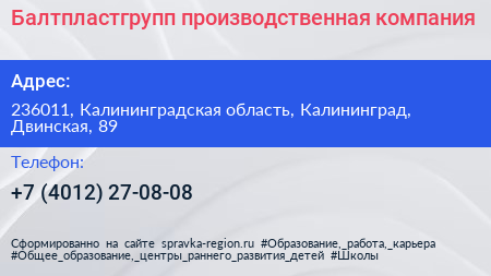 Балтпластгрупп, производственная компания по адресу 236011, Калининградская область, Калининград, Двинская, 89 в дальнейшем Организация, размещена в следующих категориях: