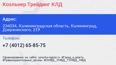 Коэльнер Трейдинг КЛД по адресу 236034, Калининградская область, Калининград, Дзержинского, 219 в дальнейшем Организация, размещена в следующих категориях: