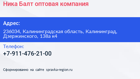 Ника Балт, оптовая компания по адресу 236034, Калининградская область, Калининград, Дзержинского, 138а к4 в дальнейшем Организация, размещена в следующих категориях: