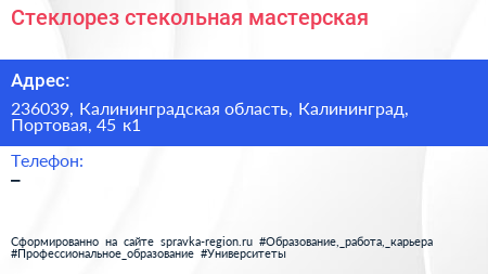 Стеклорез, стекольная мастерская по адресу 236039, Калининградская область, Калининград, Портовая, 45 к1 в дальнейшем Организация, размещена в следующих категориях: