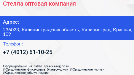 Стелла, оптовая компания по адресу 236023, Калининградская область, Калининград, Красная, 109 в дальнейшем Организация, размещена в следующих категориях: