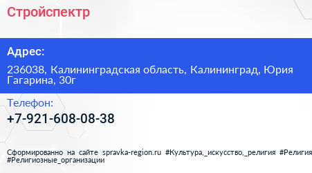 Стройспектр по адресу 236038, Калининградская область, Калининград, Юрия Гагарина, 30г в дальнейшем Организация, размещена в следующих категориях:
