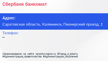 Сбербанк, банкомат по адресу Саратовская область, Калининск, Пионерский проезд, 1 в дальнейшем Организация, размещена в следующих категориях: