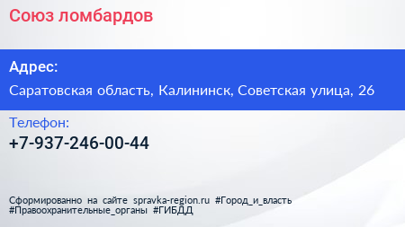 Союз ломбардов по адресу Саратовская область, Калининск, Советская улица, 26 в дальнейшем Организация, размещена в следующих категориях: