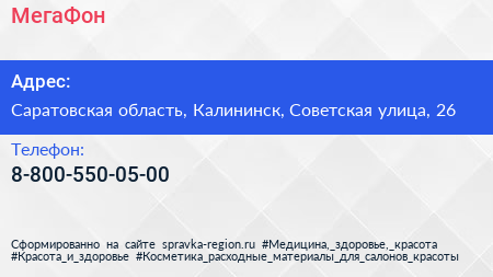 МегаФон по адресу Саратовская область, Калининск, Советская улица, 26 в дальнейшем Организация, размещена в следующих категориях: