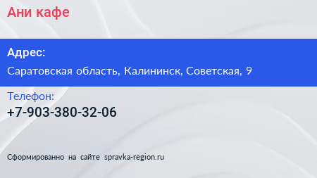 Ани, кафе по адресу Саратовская область, Калининск, Советская, 9 в дальнейшем Организация, размещена в следующих категориях: