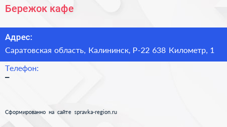 Бережок, кафе по адресу Саратовская область, Калининск, Р-22 638 Километр, 1 в дальнейшем Организация, размещена в следующих категориях: