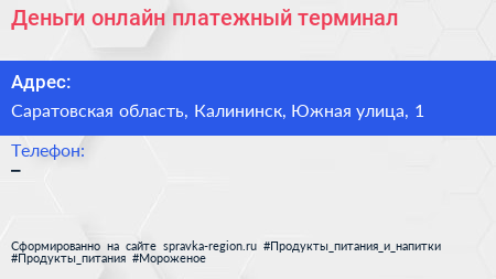 Деньги онлайн, платежный терминал по адресу Саратовская область, Калининск, Южная улица, 1 в дальнейшем Организация, размещена в следующих категориях: