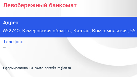 Левобережный, банкомат по адресу 652740, Кемеровская область, Калтан, Комсомольская, 55 в дальнейшем Организация, размещена в следующих категориях: