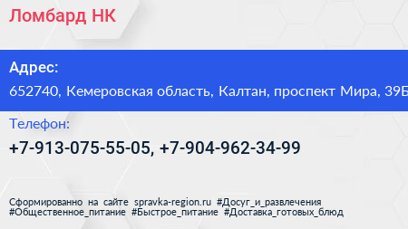 Ломбард-НК по адресу 652740, Кемеровская область, Калтан, проспект Мира, 39Б в дальнейшем Организация, размещена в следующих категориях: