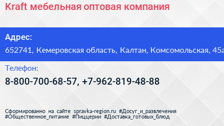 Kraft, мебельная оптовая компания по адресу 652741, Кемеровская область, Калтан, Комсомольская, 45а в дальнейшем Организация, размещена в следующих категориях: