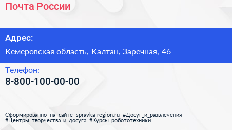 Почта России по адресу Кемеровская область, Калтан, Заречная, 46 в дальнейшем Организация, размещена в следующих категориях: