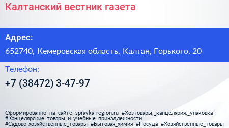 Калтанский вестник, газета по адресу 652740, Кемеровская область, Калтан, Горького, 20 в дальнейшем Организация, размещена в следующих категориях: