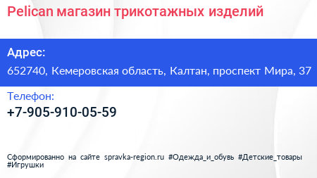 Pelican, магазин трикотажных изделий по адресу 652740, Кемеровская область, Калтан, проспект Мира, 37 в дальнейшем Организация, размещена в следующих категориях: