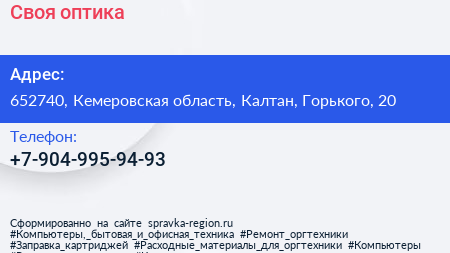 Своя, оптика по адресу 652740, Кемеровская область, Калтан, Горького, 20 в дальнейшем Организация, размещена в следующих категориях: