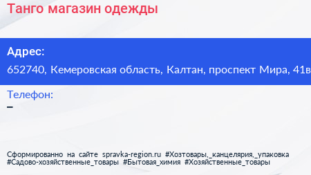Танго, магазин одежды по адресу 652740, Кемеровская область, Калтан, проспект Мира, 41в в дальнейшем Организация, размещена в следующих категориях: