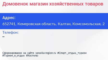 Домовенок, магазин хозяйственных товаров по адресу 652741, Кемеровская область, Калтан, Комсомольская, 2 в дальнейшем Организация, размещена в следующих категориях:
