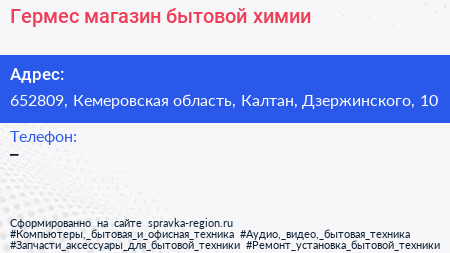 Гермес, магазин бытовой химии по адресу 652809, Кемеровская область, Калтан, Дзержинского, 10 в дальнейшем Организация, размещена в следующих категориях: