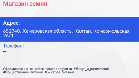 Магазин семян по адресу 652740, Кемеровская область, Калтан, Комсомольская, 26/1 в дальнейшем Организация, размещена в следующих категориях: