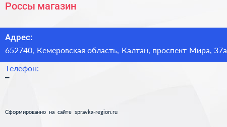 Россы, магазин по адресу 652740, Кемеровская область, Калтан, проспект Мира, 37а в дальнейшем Организация, размещена в следующих категориях: