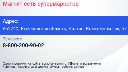 Магнит, сеть супермаркетов по адресу 652740, Кемеровская область, Калтан, Комсомольская, 57 в дальнейшем Организация, размещена в следующих категориях: