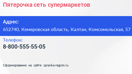 Пятерочка, сеть супермаркетов по адресу 652740, Кемеровская область, Калтан, Комсомольская, 57 в дальнейшем Организация, размещена в следующих категориях: